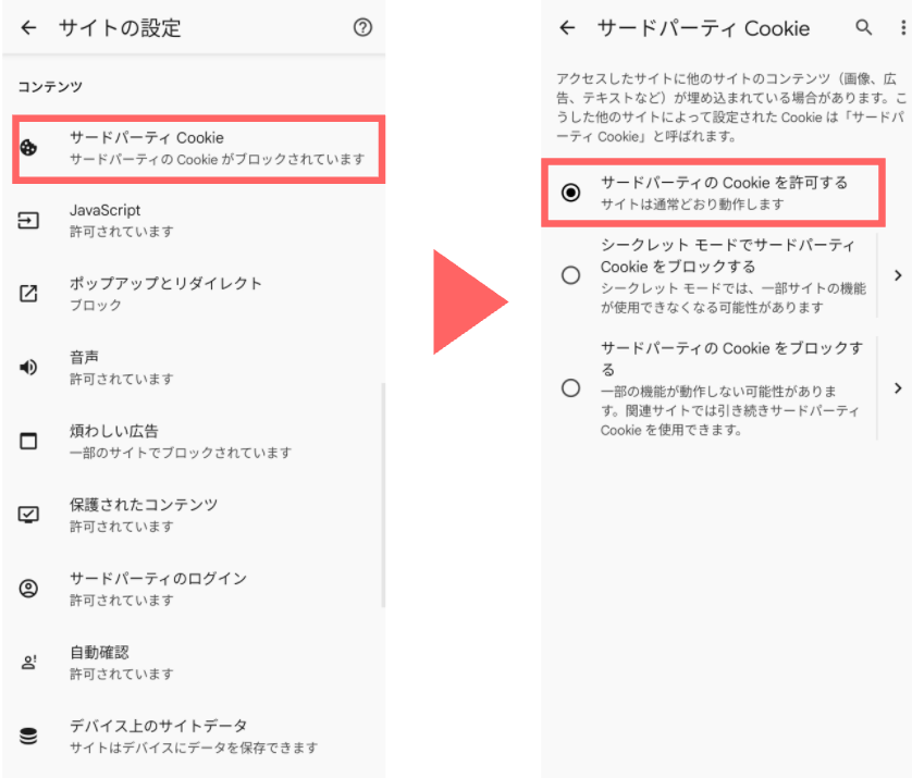 - 「サイトの設定」>「サードパーティCookie」をタップ